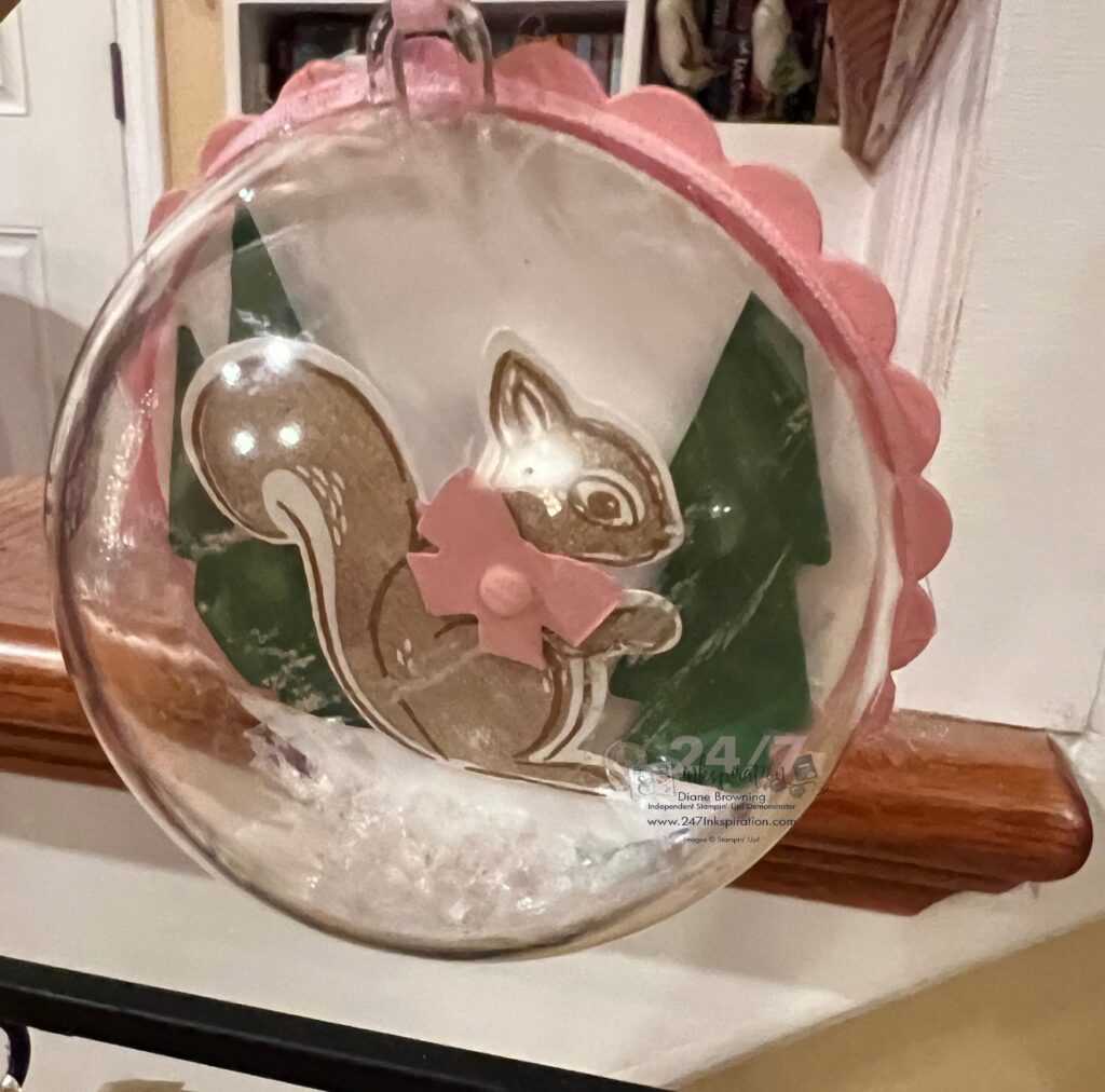 Every year, I make ornaments for an amazing group of friends. I usually make a snow globe ornament with a winter scene inside. This year I used the Fluffy Squirrel stamp set to feature inside my snow globe.