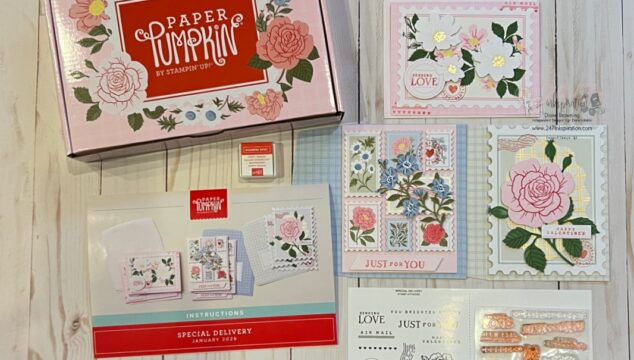 I was a little nervous that we were not going to have a Valentine's kit this year for Paper Pumpkin. This year's kit is not specifically Valentine's theme, but the soft colors and florals are just perfect for it. Plus they included a "Happy Valentine's" stamp in the set. To get the Paper Pumpkin kit shipped to you automatically, you can click the Shop button on the right, select the Paper Pumpkin link, and enter your name, address and … [Read more...] about January Paper Pumpkin-Special Delivery