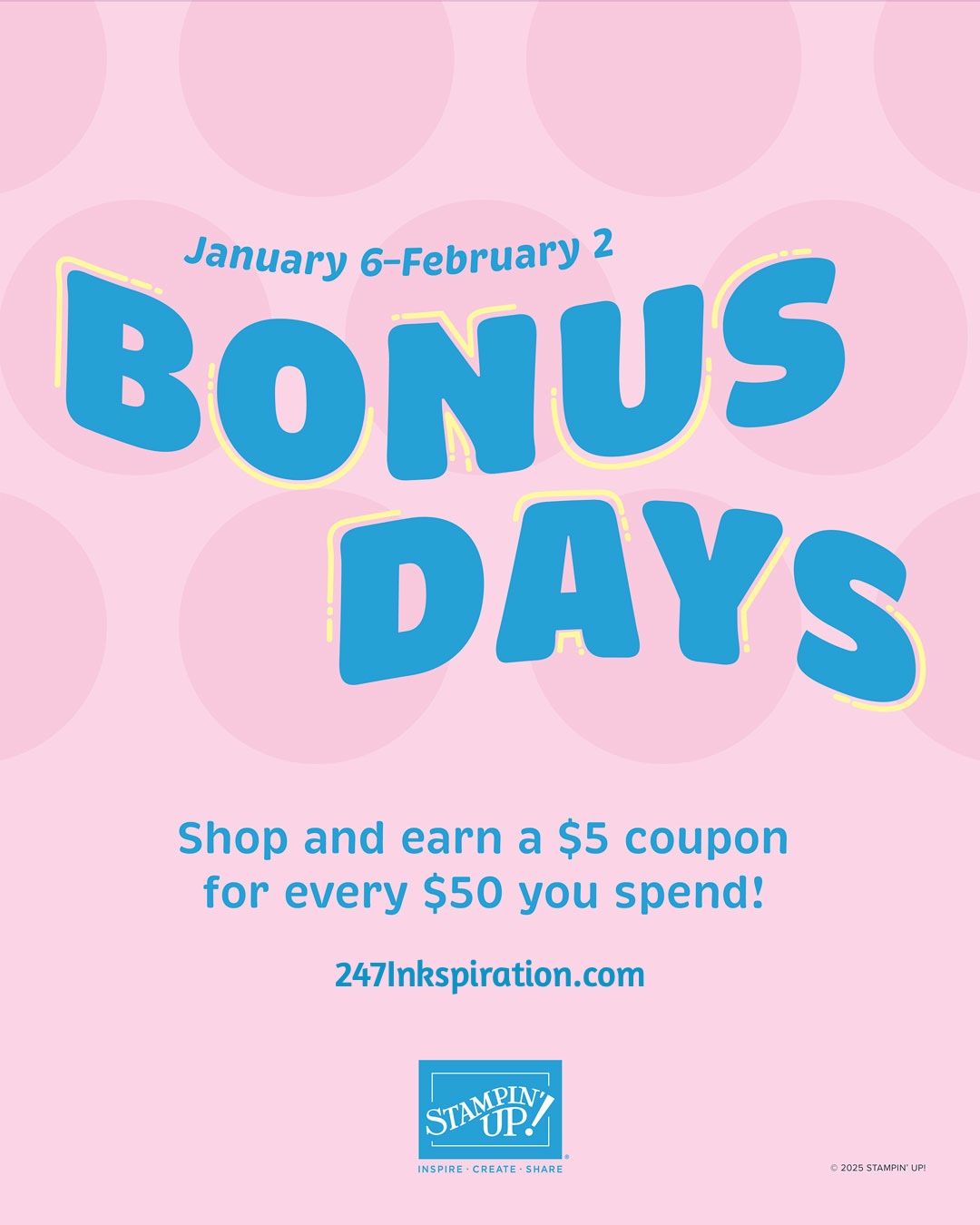 Stampin Up’s Bonus Days starts next Tuesday, January 6th. I love our Bonus Days special. For every $50 you spend pre-tax/shipping, you earn a $5 coupon to redeem in February. There is no limit to the number of $5 coupons you can earn.