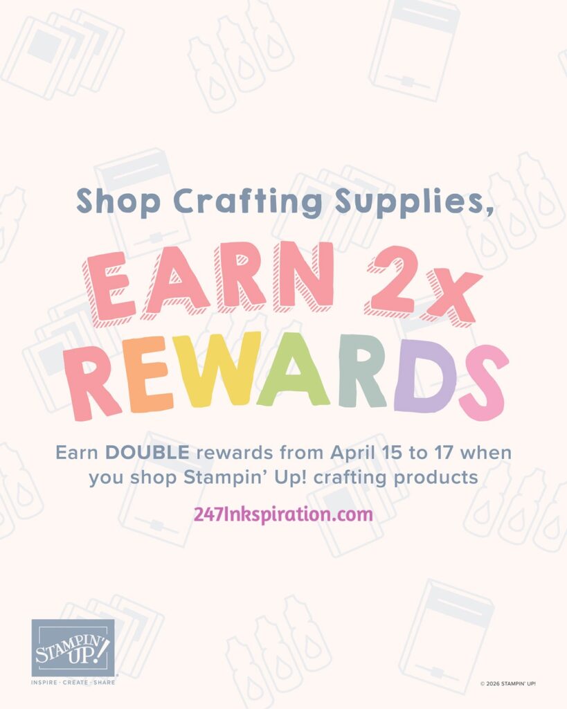 Today is the last day of Stampin Up’s Double Rewards promo. Spend at least $20 pre-tax/shipping and earn twice the amount of rewards as usual. For example, if you spend $20, you would usually earn 10% in rewards to use on a future purchase. For this promo, you will earn 20% in rewards to use on a future purchase.