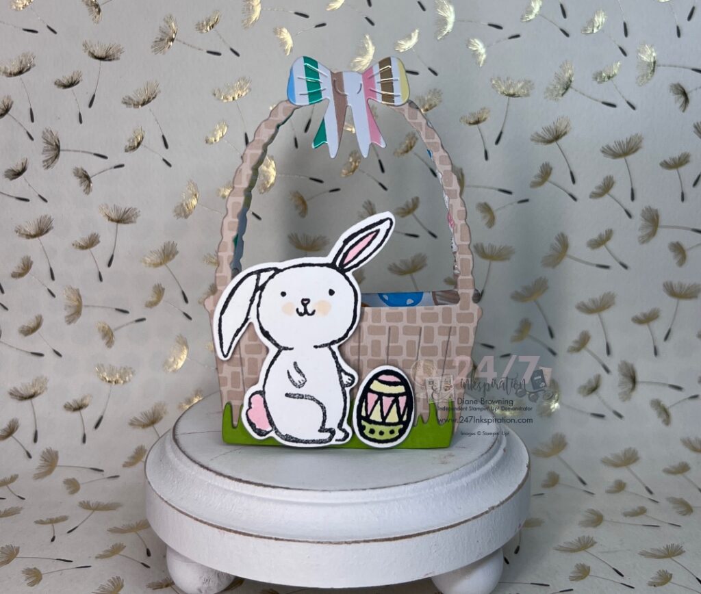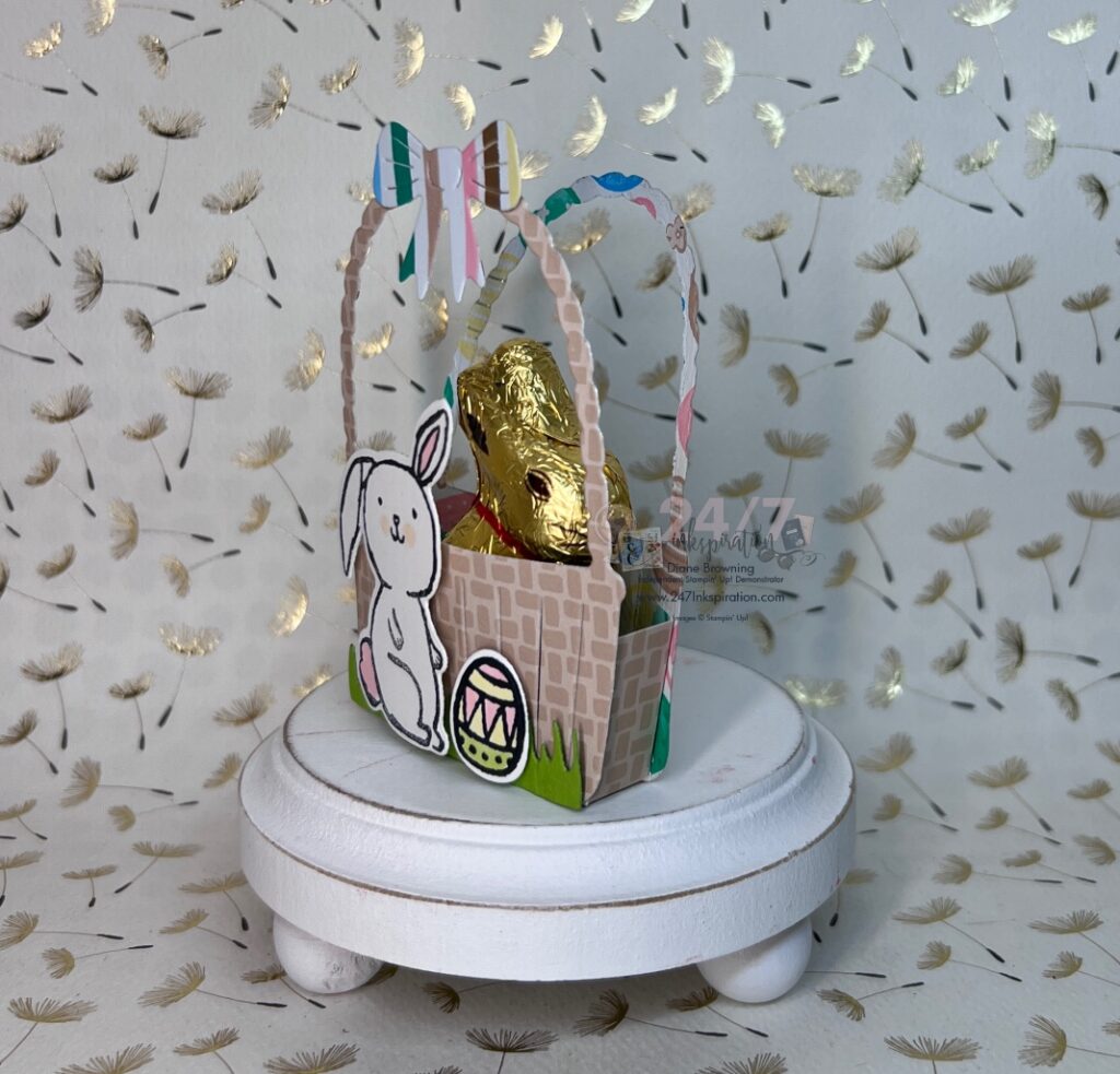 I still have the Easter Joy Suite spread out on my desk. The images in the set are adorable. The pattern paper is so bright and fun. The Easter Basket die set includes this basket, which is just the right size to include a small Easter treat.