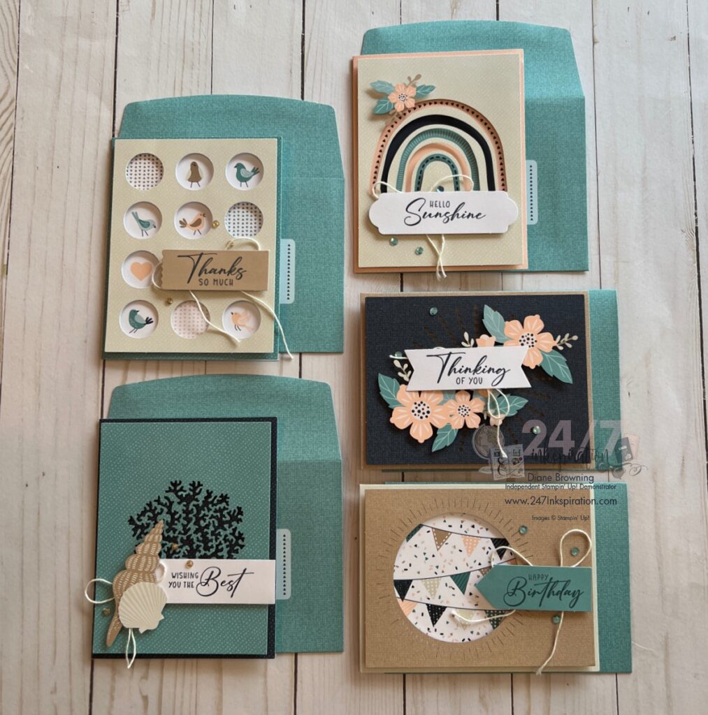 This past Saturday was World Card Making Day. Stampin Up hosted a free online event for you to craft along with the Stampin Up employees. The focus of the event was the Handmade & Heartfelt Kit. They encouraged us to purchase the kit in advance so we could make it with them. This kit makes five different cards, two each of the five designs.
