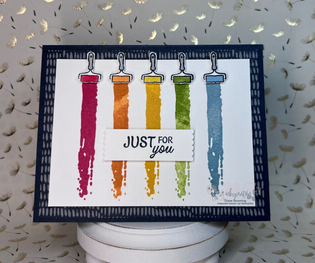 This card uses the A Rainbow of Thanks stamp set. I’m actually a bit impressed that I was able to achieve even spacing for all of the paint strips. I used our brand new Stampin Platform to do this. Because the pegs on the board are evenly spaced means that every time you shift the platform down, your stamping will be evenly spaced as well.
