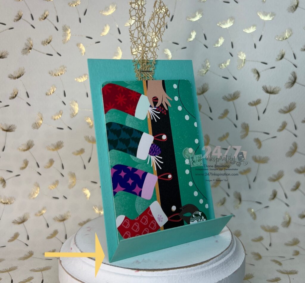 When you use a gift card envelope, sometimes it’s hard to get the gift card out. To avoid that problem, you’ll want to use a piece of card stock inside the envelope and score it near the bottom. Then when you pull the card stock tag out, the gift card comes with it. See the yellow arrow in the photo below.