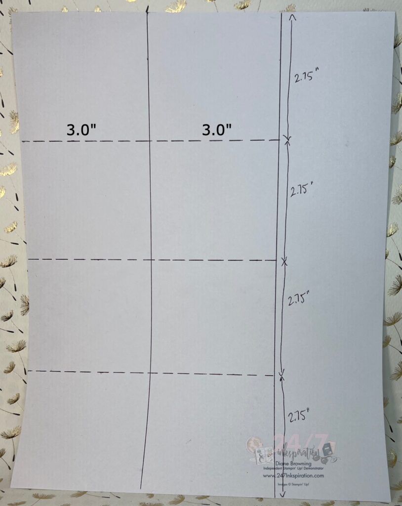 Start with an 8.5×11″ sheet of card stock. Start by scoring the three sections. Then you’ll cut your 3″ strips. You could cut first, but then you’ll have to score each strip separately. If you score first, this will save you a little time.