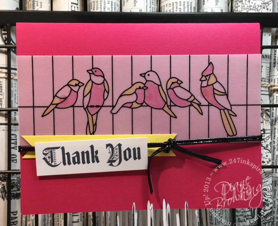 One of my favorite parts of attending OnStage is getting to play with brand new products before they are even available for sale. One of our Make & Takes from April's OnStage was a card using the brand new Graceful Glass Suite. This is such a simple card to make. The Graceful Glass vellum is meant to be cut apart into panels like this and then colored. For this card, I used two brand new colors of our Blends: Pineapple Punch and Lovely … [Read more...] about Birds On A Wire