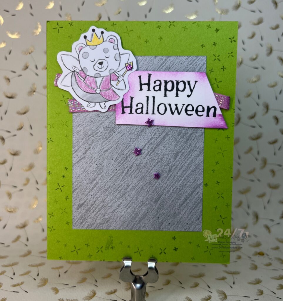 I’ll be sharing cards from our Spooky Sweet Suite collection all week. This little fairy is one of the critters that’s in the sheet of punch outs in the pattern paper pack. The sheet of punch outs makes it so quick and easy to make a card.