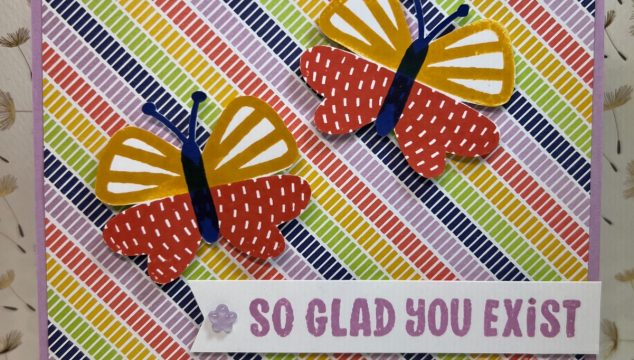 It's Friday! I'm back today with some of the bright funky butterflies in the Butterfly Kisses Suite. The pattern paper is so bright and fun that I wanted to use bright colors for my butterflies as well. The butterfly stamps are unique in that they are all separate stamps. There are a selection of top wing pieces and bottom wing pieces. And then the body is a separate piece as well. This makes it so much easier for stamping having everything … [Read more...] about So Glad…