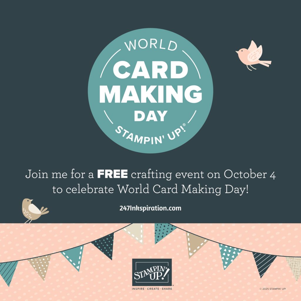 World Card Marking Day is this Saturday, October 4th from 1:00-2:00 pm PST. Stampin Up is hosting a free online event open to all. During this event, you can connect with other crafters and learn new stamping techniques. To attend the event, you can register here. Once you are registered, Stampin Up will email the link to the event prior to Saturday. Those who register will also receive a small gift after the event.