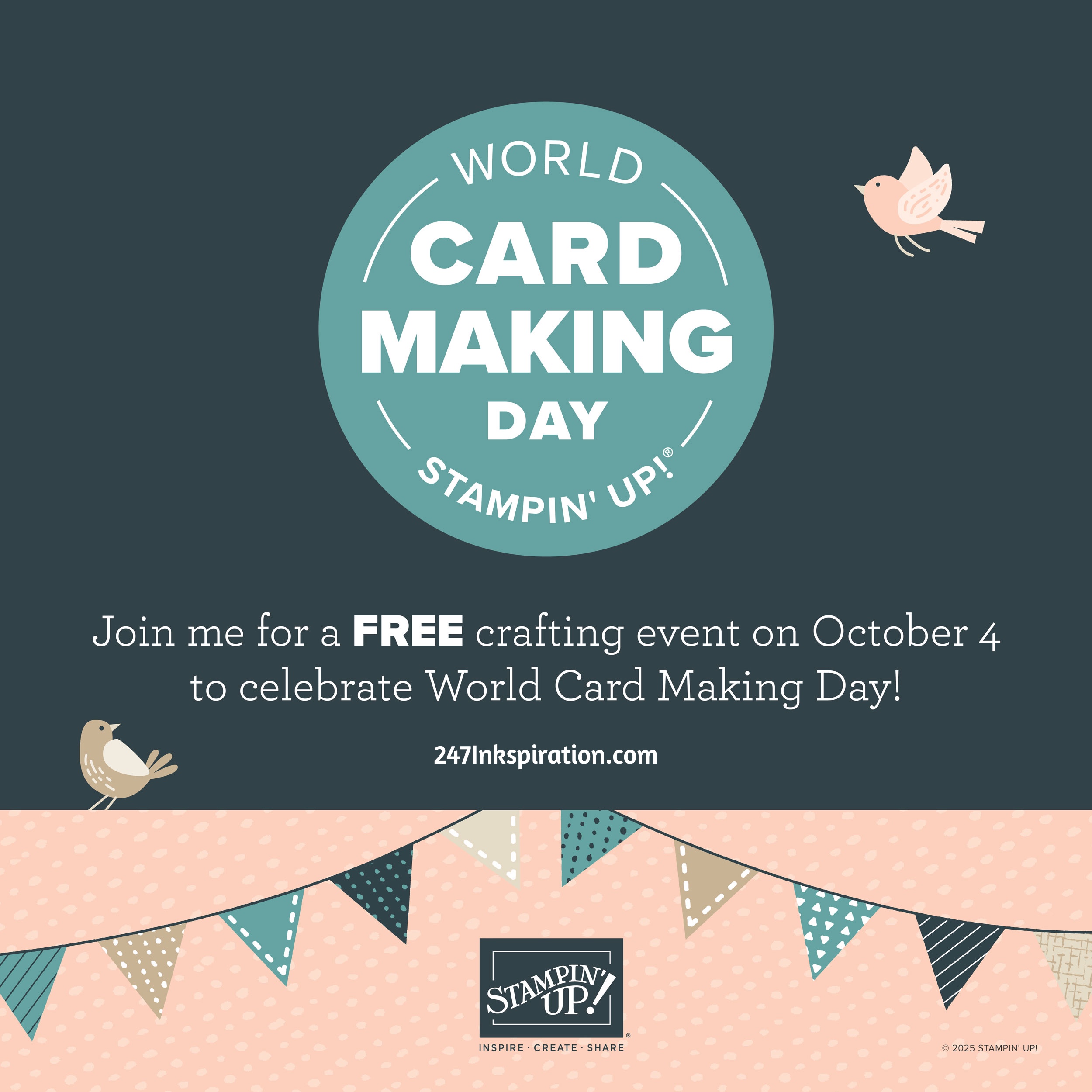 World Card Marking Day is this Saturday, October 4th from 1:00-2:00 pm PST. Stampin Up is hosting a free online event open to all. During this event, you can connect with other crafters and learn new stamping techniques. To attend the event, you can register here. Once you are registered, Stampin Up will email the link to the event prior to Saturday. Those who register will also receive a small gift after the event.